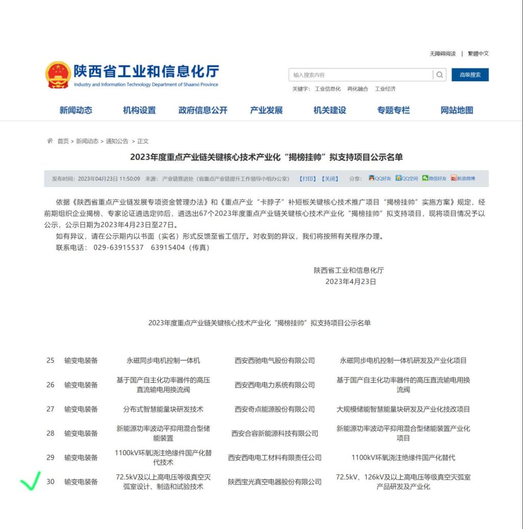 通過認真籌備、資料審核及現場答辯,由公司組織申報的“72.5kV、126kV及以上高電壓等級真空滅弧室產品研發(fā)及產業(yè)化”項目與“高鐵車載開關用真空滅弧室智能化產線建設”項目分別中榜陜西省工信廳2023年關鍵核心技術產業(yè)化“揭榜掛帥”項目與重點產業(yè)鏈發(fā)展項目,并已進入公示階段。